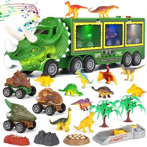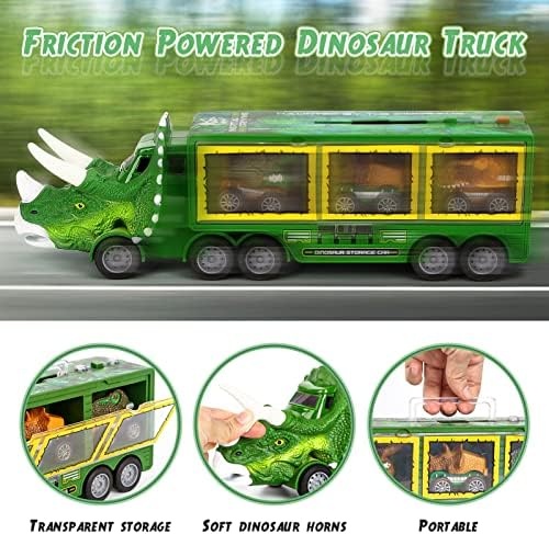 【Portable and multifunctional】 The dinosaur toys are made of durable plastic and soft dinosaur horns to delight your children. You can store 3 dinosaur cars in the truck and take them anywhere.