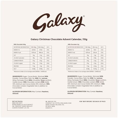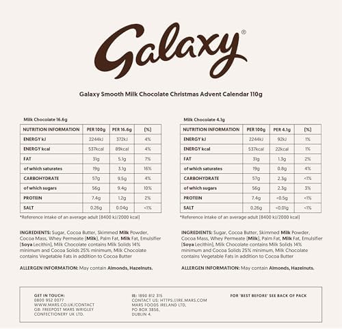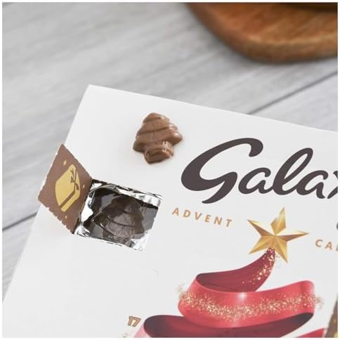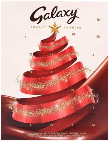 This Christmas calendar contains smooth milk chocolate in festive moulded shapes and a special Galaxy chocolate snack on Christmas Eve