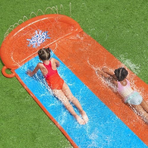 SPLASHBOOST SPRINKLER SYSTEM: The double slipnslide features built-in sprinklers that provide water coverage to maximise sliding, spraying and splashing fun