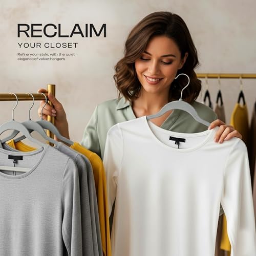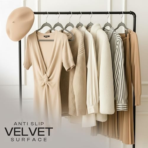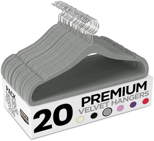 VELVET HANGERS - Set of 20 elegant grey velvet hangers, each measuring 44 x 22.5 x 0.6 centimeters. Made from sturdy ABS material that is strong enough to hold 10 pounds.