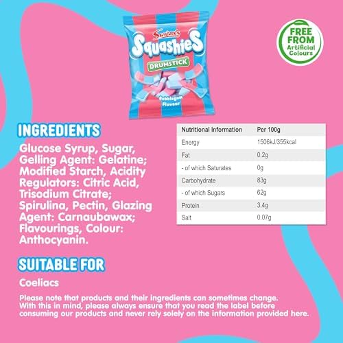 Shareable Sweetness: This bag of Bubblegum Squashies sweets is perfect as a generous sweet treat for gatherings, picnics, or as a delightful movie snack. Free from artificial colours, it's a guilt-free pleasure for everyone.