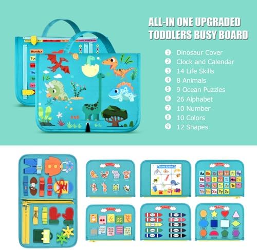 đăALL-IN ONE Toddler Busy Board, Improve Basic Life SkillsăToddler montessori toys for 3 4 5 6 years old include life daily skills section: clock and calendar, hat tether, clothes buttons, safety buckles, cow horns buckles, velcro, trouser belt buckles, shoelaces, zippers, snaps, kids can practice these to get independent basic life skills. Toddler busy board can develop kidsâ fine motor skills and enhance hand-eye coordination.