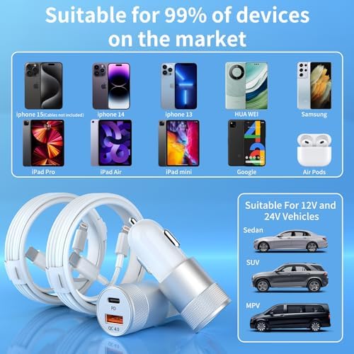 【Universal Compatibility】You will never feel any compatible issue using this car charger, can fast charge all prevailing phones and E-devices. Supports fast charge for iPhone 15/14/13/12/11/Pro/Max/Plus/XR/XS/X/8/7, iPad Air/iPad Pro/iPad Mini, Samsung Galaxy, tablets and more. (Comes with USB C to lightning fast charging cable, does not include USB A to lightning/USB C cable and USB C to USB C cable)