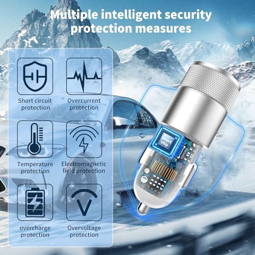 【Upgrade design】The ABS fireproof materials offers better scratch resistance and long service life. Gold-plated tubing reduces heat during charging while maximizing charging speed and efficiency. The thumb-sized body of the car charger fits perfectly with most cigarette lighters, ensuring secure charging even on the bumpy roads, preventing poor contact and power outage caused by vibration during driving. The soft blue LED light is useful for finding USB sockets and driving safely in the dark