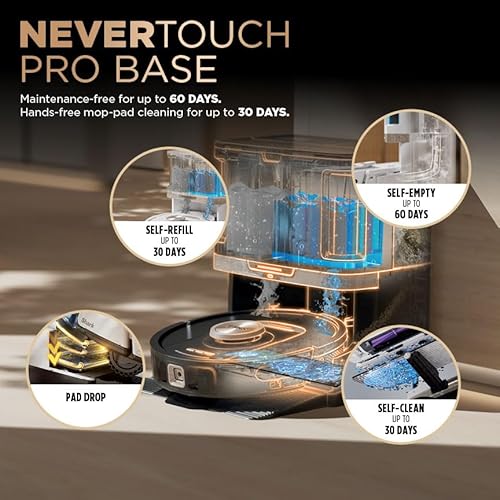 Automatic cleaning and maintenance: The robot empties debris into the 60-day-capacity dustbin and refills its own water tank for up to 30 days, washing and drying the pad after every clean