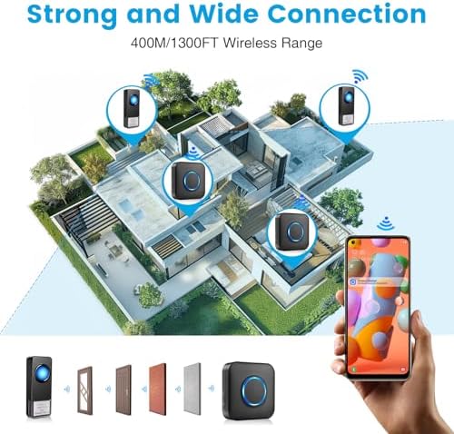 đź””400M Wireless Range & 32 Melodies - In addition to receiving notifications on your mobile phone, family members can also receive visitor information through the receiver. The 400 metres wireless range of the waterproof door bell covers your entire home, and you can choose your preferred tone from 32 available melodies.