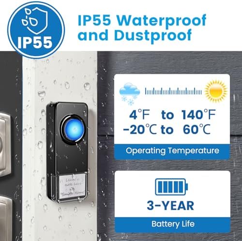 đź””IP55 Waterproof & Memory Function - The wireless doorbell button is equipped with a waterproof film, allowing it to function smoothly even in wind and rain. The memory function enables the door bells to retain your settings, so they do not need to be reconfigured after a power cut or restart.
