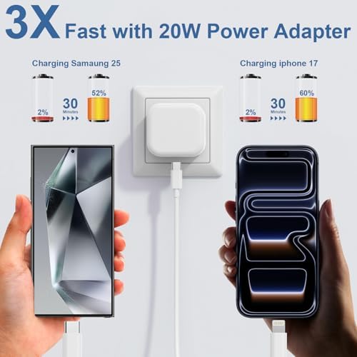 šćHigh-Speed ChargingćiPhone Charger Enjoy fast charging with 20W max output for your iPhone, Samsung phones(only plug), and other devices . which is 3X faster than 5W charger. Such as it can charge iPhone 14/13/12/11 series to 50% capacity in about 25 mins, saving you more precious time.