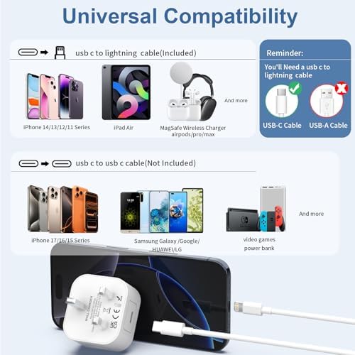 šćBroad Universal Compatibilityć Use our 20W PD iPhone fast charger to for iPhone14/14 Plus/14 Pro Max/14 Pro/13 Pro/13 Mini/13 Pro/13 Pro Max/12/12 Mini/12 Pro/12 Pro Max/SE 2020/11/11 Pro/11 Pro Max/XS/XS Max/XR/X 8 Plus, iPad and more. This Power Delivery 3.0 FAST charger also charge for iPhone 7 6 Plus, iPhone 5 5c 5s SE in a original charging speed.