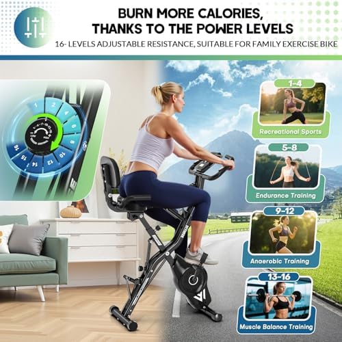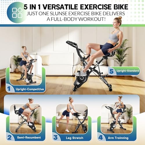 5-IN-1 FOLDING EXERCISE BIKE FOR HOME:Choose from different positions at your leisure: upright position for a classic riding experience; racing position for high-intensity aerobic training; semi-recumbent position for a more relaxed riding experience. For a balanced training, this exercise bike also comes with hand and leg resistance bands for rowing and stretching exercises. Owning this exercise bike is like owning a small gym - and it's worth the money!