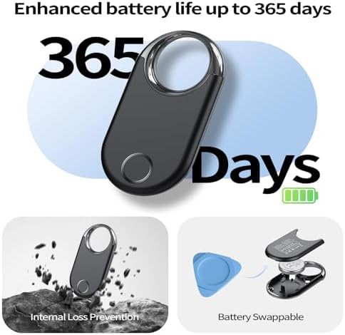 【All-Weather Durable Design】 The Smart tag features standard water resistance (1 meter for 30 minutes), protecting against daily splashes and rain. Its lightweight plastic shell with an aluminum frame ensures durability without adding bulk. Powered by a CR2032 battery, it provides about 1 year of use and includes a 3-second replacement feature with the provided tool. Compatible with air tracker tags, this item finder integrates into a smart finder tags system for seamless tracking.