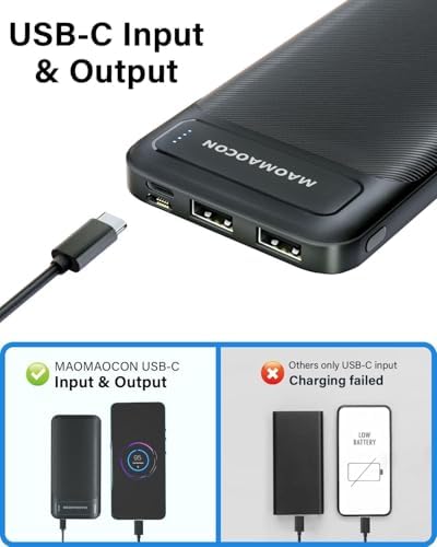 【USB C Input & Output】Upgrade portable battery charger has a USB-C In & Out port to perfectly fit your new lPhones, lPad and all upcoming USB-C devices. Also configured two USB-A output ports that recognize all connected devices and distribute load up to 5V 2.4A effectively. Therefore our phone battery power bank can work with not only all the phones, tablets but your smaller devices like AirPods, Bluetooth headphones, fitness trackers, smart watches, heated vest etc.