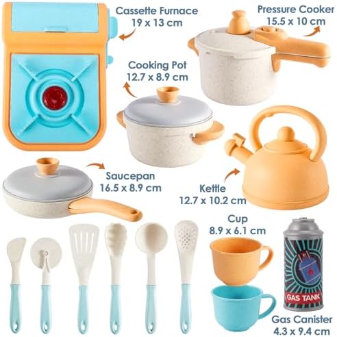 Kitchen Accessories: This 2 in 1 afternoon tea and kitchen playset includes everything children need to make delicious treats: 1 stove, 1 can of gas, 1 kettle, 1 pressure cooker, 1 saucepan, 1 pot, 2 cups and 6 kitchen utensils.