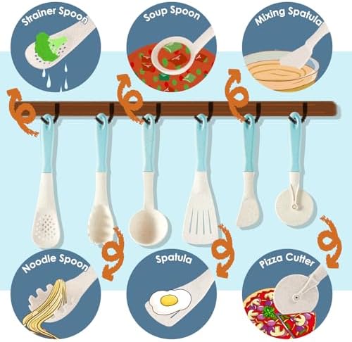 Various Utensils Toy: This kitchen toys set has six different utensils to learn about the uses of different kitchen playset accessories and differentiate them. For example strain water, spoon soup, mix ingredients, spoon pasta, flip food, cut pizza, etc. The handle has a hanging hole for easy storage.