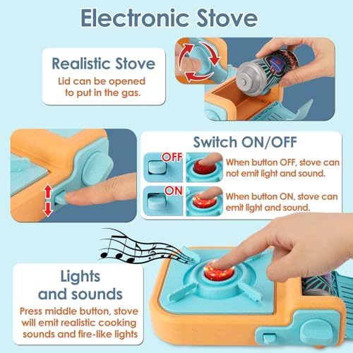 Multi-functional Stove: The stove imitates real cookers. Kids open the lid and put the gas in to begin cooking! When they place cookware on the stove, it will make a frying sound and a fire like light, simulating a real cooking experience. The adjustable heat control knob makes a ‘dada’ sound so kids can enjoy controlling the heat like a real chef.