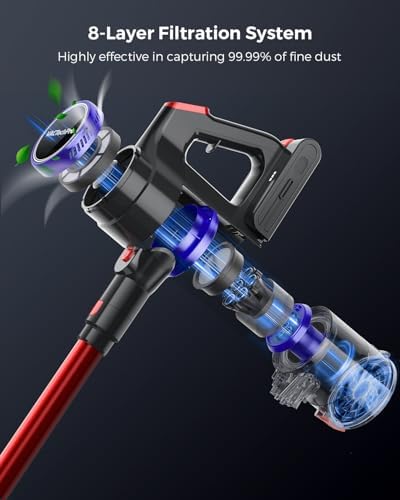 【Advanced Filtration System】This cordless vacuum cleaner utilizes multivortex air technology, which effectively separates dust and air with 7 times higher centrifugal force, along with an 8-layer filtration system designed to capture fine particles such as dust and pollen. The system includes an activated carbon-enhanced HEPA filter to help reduce potential allergens during use, contributing to cleaner air output.