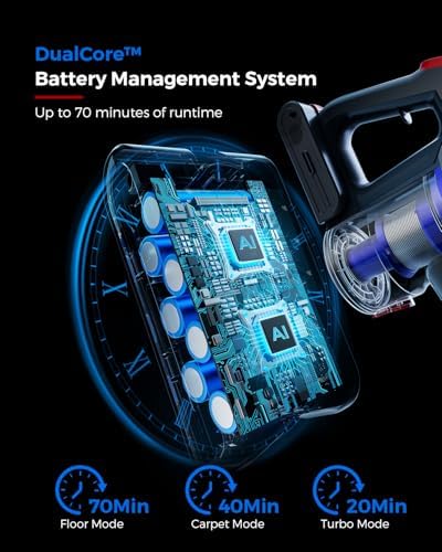 【DualCore Battery Management System】This cordless vacuum cleaner features an intelligent DualCore protection system with dynamic load balancing technology, helping maintain consistent suction power. It offers multiple cleaning modes to suit different surfaces: Floor Mode (Up to 70 minutes runtime), Carpet Mode (Up to 40 minutes runtime), Turbo Mode (Up to 20 minutes runtime). The battery(B0FDWKQJW6) can be removed for charging. Alternatively, you can mount the entire unit on the charging bracket to recharge it.