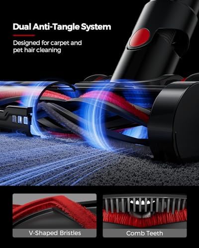 【Anti-Tangle Cleaning System】This cordless vacuum cleaner is engineered with a specialized comb structure and V-shaped bristles to help minimize hair wrap, making it effective for picking up long hair and pet hair. The motorized floor brush has a swivel design for improved maneuverability, allowing access under furniture and into tight spaces. Built-in green LED lights provide better visibility when cleaning in dimly lit areas.