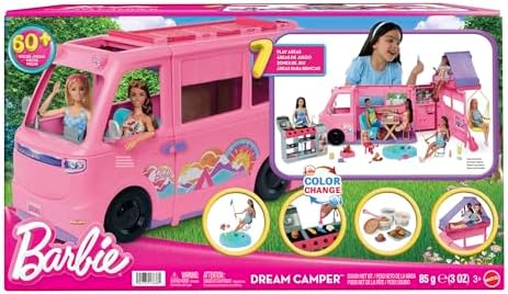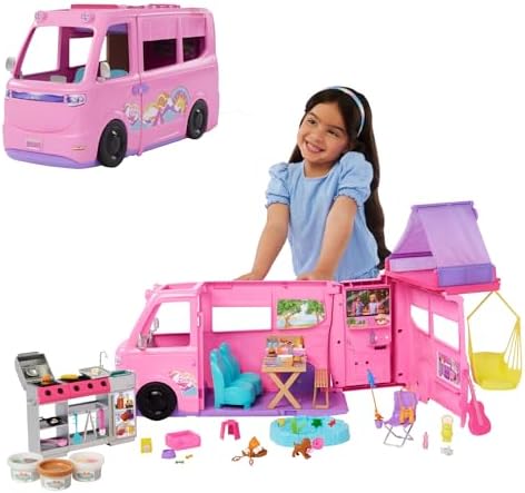Head to the great outdoors with the Barbie Dream Camper playset, featuring 7 play areas and 60+ accessories, including a puppy, to inspire endless camping stories.