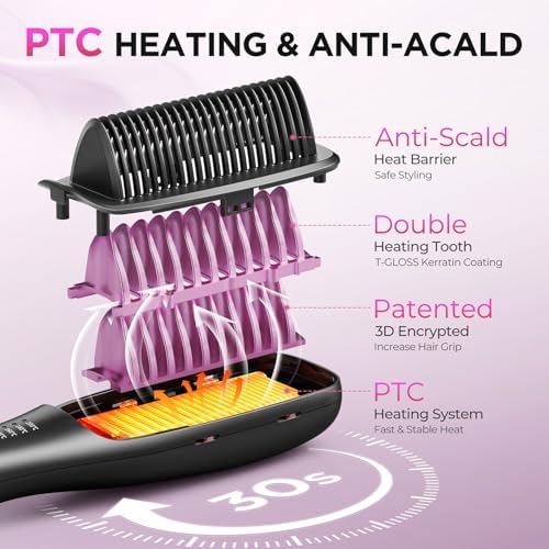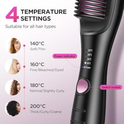 Fast PTC Heating & 4 Temperature Settings:Equipped with an upgraded PTC ceramic heating system, this brush heats up in just 30 seconds, saving your precious time. It distributes heat evenly to reduce heat damage by up to 50%, leaving your hair healthier, silkier, and straighter. Choose from four temperature levels (140°C, 160°C, 180°C, 200°C) to suit your hair type and styling needs.
