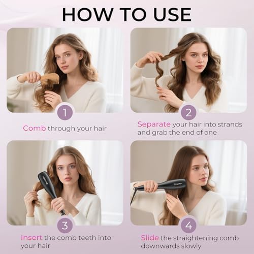 Easy to Use & Fully Equipped:The straightening brush comes with a storage bag, hair clips, and a gift box, perfect for storage or travel. To use, press and hold the power button for two seconds to turn on the device — it starts at the default setting. Short-press the button to switch between temperature levels. Simple, convenient, and user-friendly!