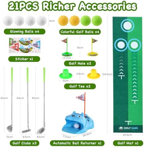 【Deluxe Set & Multiple Play Creativity】Elevate your game further with our upgraded set, now featuring 2 more glow-in-the-dark balls than standard kits—maximizing nighttime and fun! and enhanced club head colors for an even better experience.You can customize your golf play game ! Such as Practice precision with basic putting, test reflexes with the Tiger Return Challenge, or set up a mini obstacle course. Enjoy glow-in-the-dark night games or bond with family in friendly Parent-Child Duels—endless creative ways to play.Why settle for basic sets? Own the upgrade that truly lights up your playtime!
