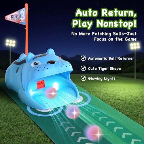 【Cute Tiger Auto Ball Returner】(Requires 2*AA batteries, not included) Meet your new golf buddy - A tiger auto ball returner.The light-up tiger cub magically shoots balls back through its mouth whenever kids make a successful putt. Nighttime glow function keeps the fun going after dark, creating endless interactive challenges and giggles.