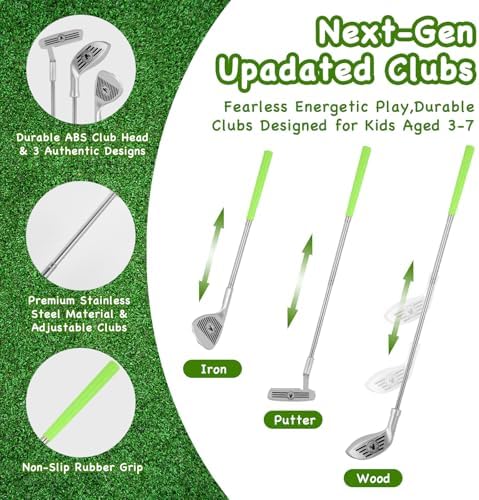 【Upgraded Stronger Toy Clubs】 Built for wild swings! Our upgraded kids’ golf clubs are crafted from durable stainless steel and feature a telescopic design that adjusts for children aged 3 to 8. They boast realistic club heads, a fresh color scheme, and textured rubber grips that are easy for tiny hands to hold securely. The non-slip handle helps prevent flying clubs during those overzealous putts. It’s time to say goodbye to flimsy plastic!