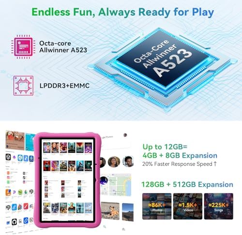 🌟【12GB+128GB Memory—Reduce Your Memory Worries】 This tablet for kids is powered by the Allwinner A523 octa-core processor, with 4GB real RAM & 8GB virtual RAM expansion. Whether reading picture books, watching animations, learning languages, playing games, or making video calls, it can easily handle it. 128GB ROM, with 512GB TF expansion, provides ample storage for educational and entertainment content. Parents and children no longer have to worry about insufficient memory or app lag.