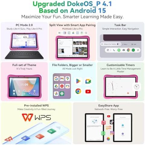 🌟【Equipped with Android 15 + DokeOS P 4.1 System - Smarter for Kids, More Convenient for Parents】Powered by the latest Android 15 system and DokeOS P 4.1 enhanced version, the Android 15 tablet's interface is intuitive and simple, tailored to children's nature. The system is also compatible with mainstream educational and video apps, allowing children to explore independently while parents maintain full control.