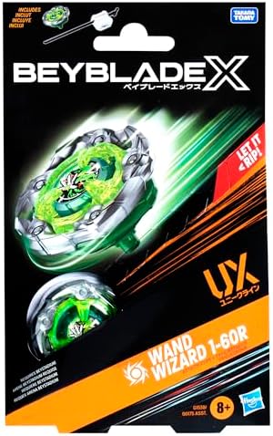 INTERCHANGEABLE DIE-CAST BLADES: includes Takara Tomy-designed Beyblade X launcher and top with authentic die-cast metal parts: Wand Wizard 1-60R UX Right-Spin Attack Type with a Stamina Type Blade. Strong centrifugal force combines with swift dash attacks