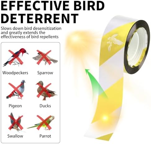 【Durable, Weatherproof and Reusable】 Made from thickened PET polyester film, each bird scarer tape roll is waterproof, UV-resistant and tear-resistant—built to last through rain, wind and sun. It’s a cost-effective and reusable solution for bird deterrence across seasons. Whether you're protecting gardens, greenhouses or rooftops, this anti pigeon device remains reliable over time. Note: this tape is non-adhesive and must be tied or hung for use.