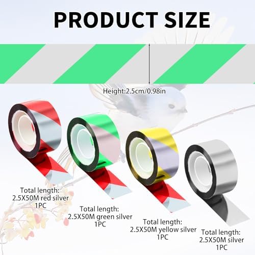 【Multi-Coloured Reflective Tape for Maximum Visibility】 This set includes four rolls of reflective bird scarer tape in vibrant colour combinations: green-silver (with red reverse), yellow-silver (with red reverse), red-silver (double-sided), and pure silver. These varied tones enhance light reflection and movement under sunlight and wind—creating a strong visual deterrent for pigeons, crows, starlings, and other birds. Ideal for wide outdoor areas where consistent visual disruption is needed.
