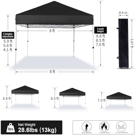 Spacious & Versatile Design - Measuring 8X8 FT, this canopy provides ample space for you, your friends, and family to enjoy a variety of outdoor activities and gatherings. Its spacious design makes it ideal for parties, commercial events, and a wide range of other outdoor occasions, ensuring everyone has room to relax and have fun.