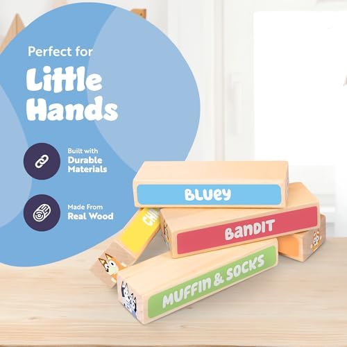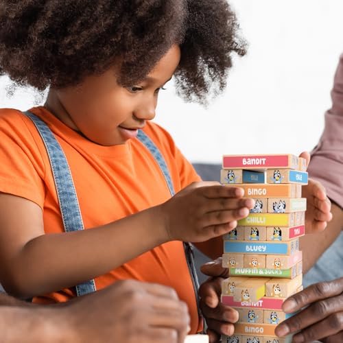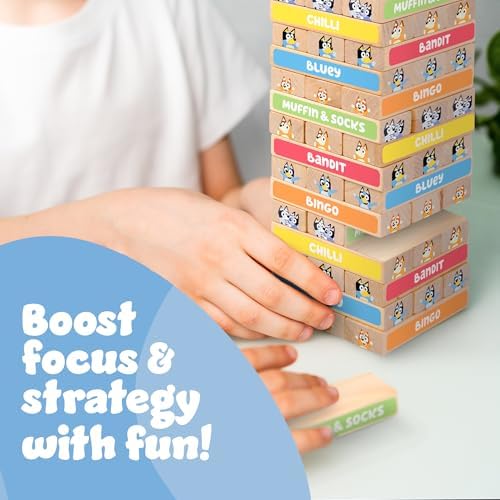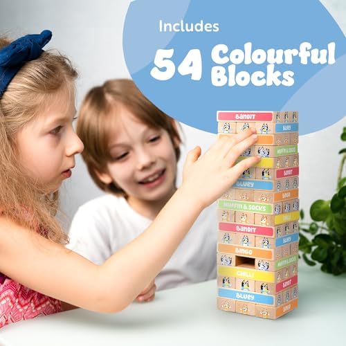 54 Colourful Bluey-Themed Wooden Blocks: This Bluey Tumbling Tower game includes 54 vividly colored wooden blocks featuring Bluey and friends, adding a playful touch to every game. Ideal for family game nights or solo play, it offers endless stacking and toppling fun.