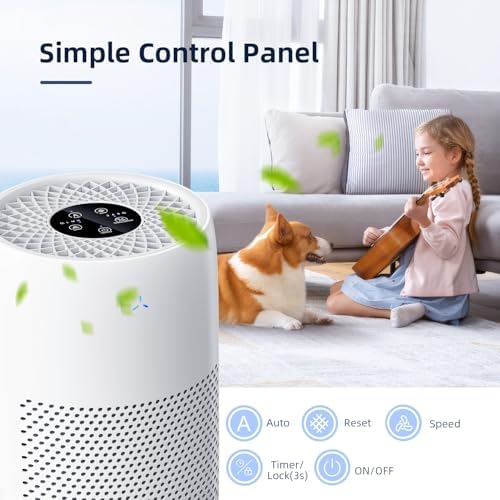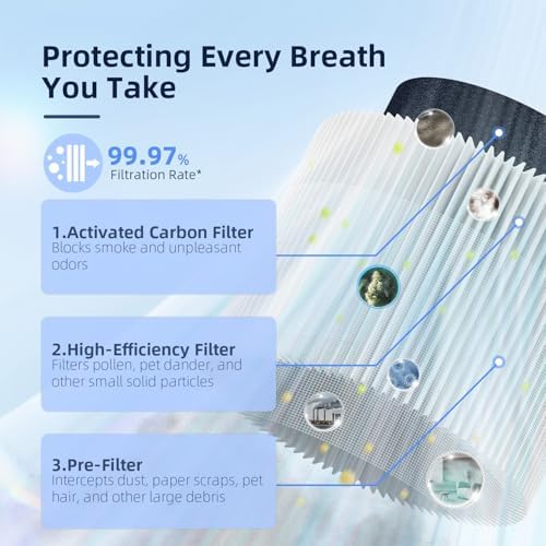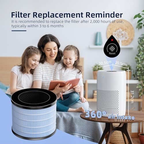 Triple Filtration System: This air purifier is equipped with a preliminary filter, a high efficiency filter and an original three-layer activated carbon filter, which can effectively block pollen, pet hair and other environmental pollutants, with a filtering efficiency of up to 99.97%. In addition, we offer replacement filters with antibacterial function. It is recommended to replace the filter after 2000 hours of use. A filter replacement indicator flashes red when you need to replace it, ensuring that the effectiveness of air purification is always at its peak