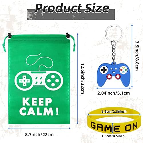 Detailed Size Information: each video game favor bag measures around 32 x 22 cm/ 12.6 x 8.7 inches, each silicone bracelet measures around 6.5 x 1.3 cm/ 2.5 x 0.5 inches, and the size of each video game keychain is around 5.1 x 8.8 cm/ 2.04 x 3.5 inches, suitable for most people