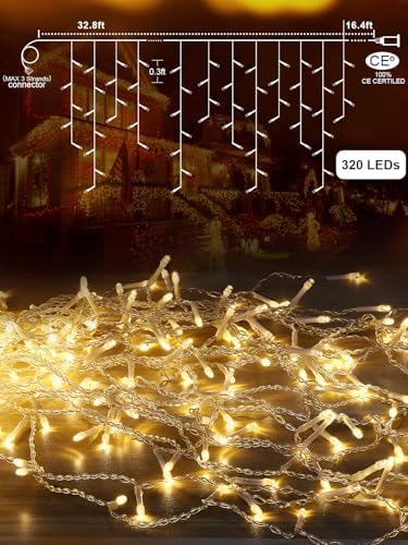 【Durable Christmas Icicle Light】These 10m outside Christmas lights feature a 5m extra-long lead for easy installation and a plug-in design for stable brightness. The christmas icicle light has 60 hanging chains totaling 320 premium LED spaced 10cm apart. Made of durable material, the near-clear strands blend seamlessly into surroundings, making them perfect for christmas decorations, eaves, and patios. The tail plug allows easy connection of multiple strings for expanded decoration