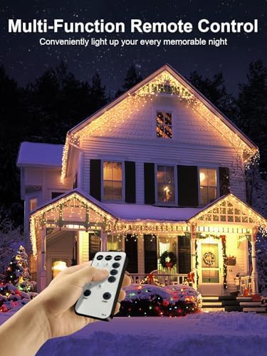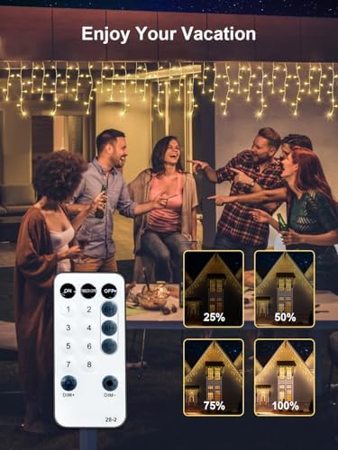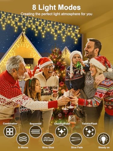 【8 Modes + 4 Brightness】This outdoor icicle lights string offers 8 stunning lighting modes, including waves, sequential, slow glow, chasing/flash, slow fade, twinkle/flash, and steady on. Each mode creates a unique ambiance, from the gentle ebb and flow of waves to the dynamic sparkle of chasing lights. With 4 adjustable brightness levels, you can easily switch from a gentle, warm glow to a bright, sparkling display, making every moment of your Christmas celebration perfect