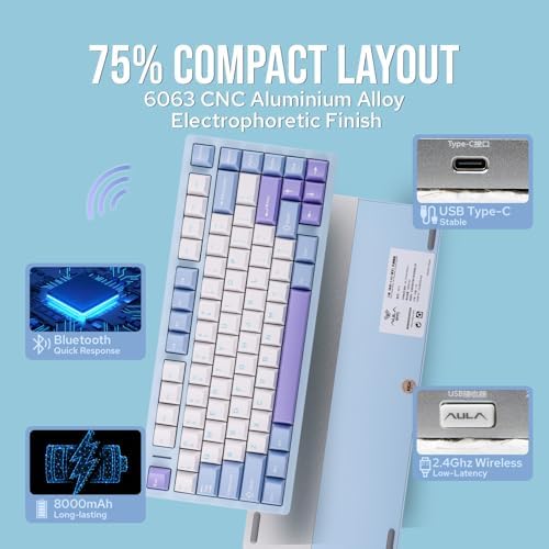8000mAh Battery for Tri-Mode Connection: Enjoy seamless connectivity with the AULA M75, featuring three modes—Type-C wired, 2.4GHz wireless, and Bluetooth 5.0. Compatible across Mac, Windows, Android, Linux and Mainstream Gaming Controllers, this keyboard ensures needing for any user. Featuring a massive 8000mAh battery provides extended usage time, allowing you to game or work without interruptions. Say goodbye to frequent charging and hello to a reliable keyboard that keeps pace with your activities