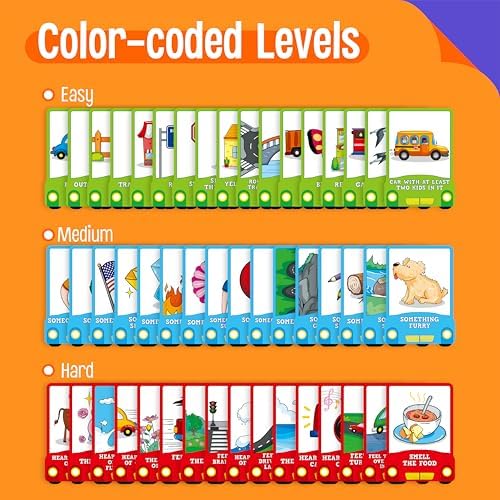 3 Different Levels: The cards are divided into three difficulty levels, color-coded for easy identification. The green green cards represent the easiest level, just to find clear and easily identifiable objects.The blue cards are intermediate, finding items based on specific characteristics. The red cards are the most challenging, the content related to sensory experiences, such as identifying smells.