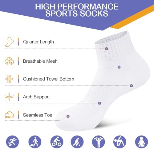 Quarter Socks Women with Arch Support: These white trainer socks feature an arch support design to enhance comfort and reduce foot pressure. The quarter length style, with a high elastic cuff, ensures a secure fit during activities and protects your ankles
