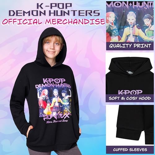 Official KPop Demon Hunters Merch - Licensed pullover hoodie for girls and teens featuring Rumi, Mira and Zoey, the iconic Huntrix trio. A must-have hip hop streetwear for true fans of the Netflix-inspired KPop universe
