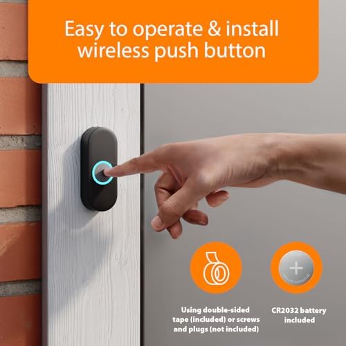 SUPER EASY INSTALLATION: easily install the push button (operated with the included CR2032 battery) with the provided double sided-tape or screws. The chime is portable and you can take it wherever you go in the house. It works on 3 AA batteries (not included).