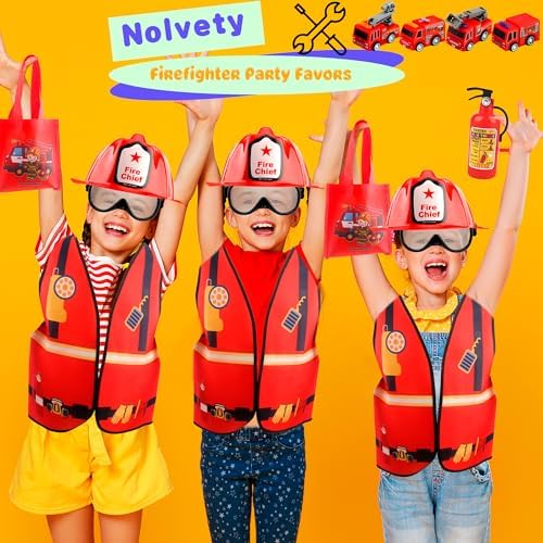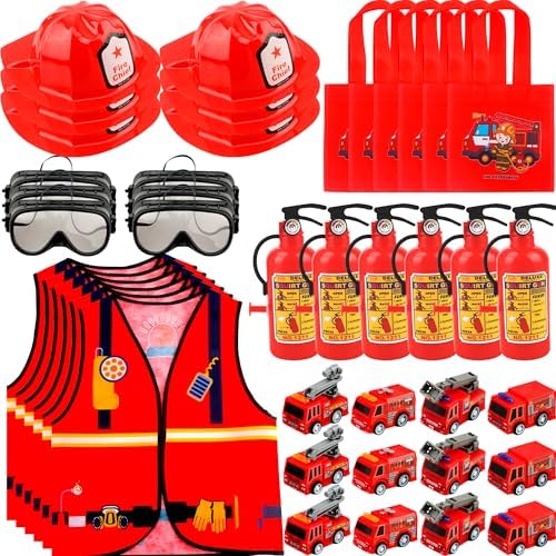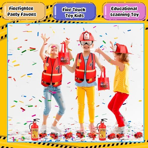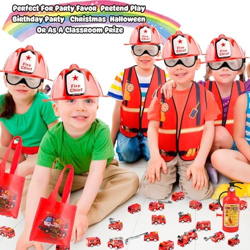 【Package Contents】: The package contains 42 pieces of professional firefighter costumes for children. The package includes 6 firefighter vests, 6 hard hats, 6 fire-themed tote bags, 6 pairs of goggles, 12 fire trucks and 6 fire extinguisher water blaster toys. Children's costumes provide children with fun and imaginative playtime, in which their imagination and creativity are fully developed