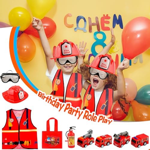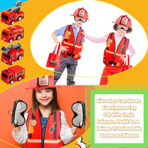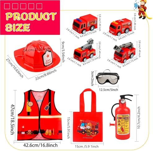 【Size Detail】: Kids firefighter costume set is designed to fit most children's sizes, and the vest is loose without zipper restrictions. The mini pull-back fire truck toy measures approximately 5.3 x 3.1 cm/ 2.1 x 1.2 inches ( L x W ), and the height is approximately 2.9-5.2 cm/ 1.1-2 inches. The goggles are 12.5 x 5 cm/ 5 x 2 inches, which is very suitable for children to wear for role playing