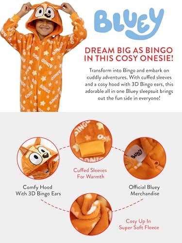 Awesome Bluey Gifts: Ideal as a Bluey gift or as a birthday gift, this fleece onesie for kids is sure to be a hit with young Bluey and Bingo fans. A must have for Christmas and all winter long