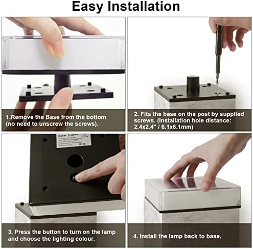 Easy Installation - No wire required. Please remove the Base from the bottom first (no need to unscrew the screws). Suitable for various size of post, 3x3, 4x4, 5x5, 6x6 inches and etc. Dimension of the lamp: 5.1" x5.1"x1.6" / 129.5x129.5x40mm