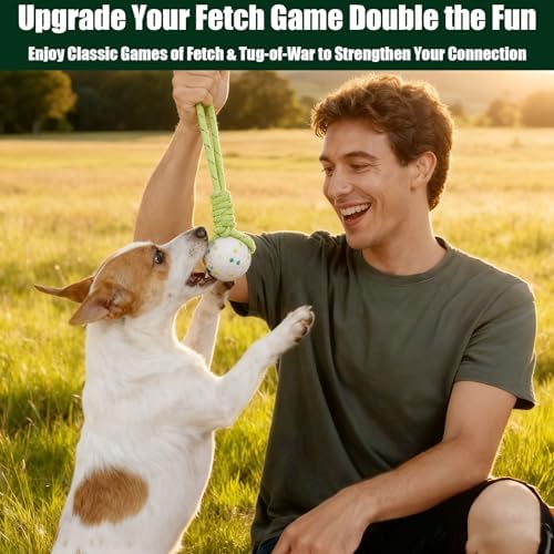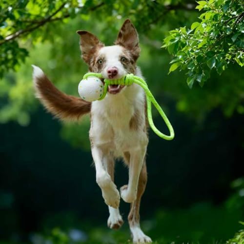 【Tug of War & Fetch Dog Toy】- The colorful dog toy ball with the rope handle takes tug-of-war to the next level, The strong rope isn't just for tug-of-war—tie it to a garden tree or a sturdy doorframe to create a self-entertaining toy that keeps your dog engaged. It is built for tough play.