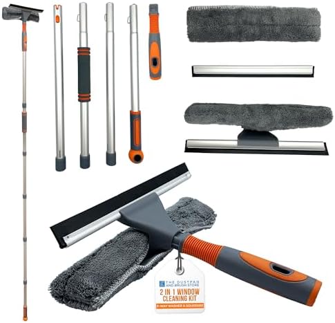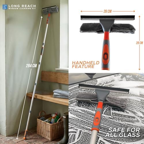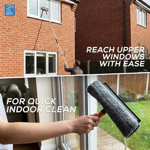Durable Telescopic Window Cleaner – It is an extendable window cleaner that can reach up to 248cm long and is made with strong 6-section aluminum poles. It is an ideal upstairs window cleaning kit for windows, sky lights and ceilings / roof windows.
